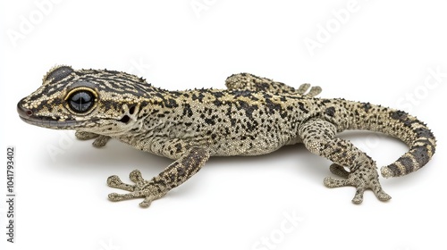 © stopcontrol, Obraz premium Uncommon leaf-tailed gecko with its intricate camouflage patterns, perched on a white background.