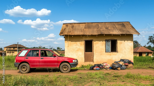 © Erzsbet, Fototapeta premium Uncompleted House with Building Materials and Red SUV in Ugandan Urban Landscape