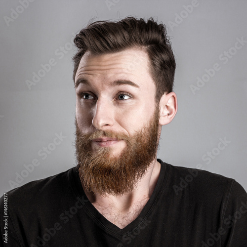 © yurko_gud, Fototapeta premium Unconfident and worried young man isolated on gray background