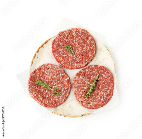 © New Africa, Fototapeta premium Uncooked meat patty with rosemary isolated on white, top view