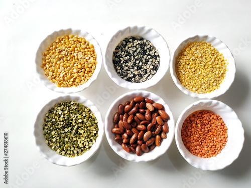 © rajiv, Fototapeta premium Uncooked pulses,grains and seeds in White bowls over white background. selective focus