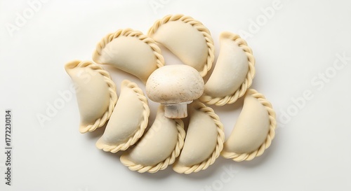 © Ayaz, Fototapeta premium Uncooked Varenyky Dumplings with Fresh Mushrooms on White — Homemade Traditional Meal Top View.