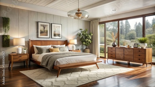 Naklejka premium Uncover Ashley's Mid Century Modern bedroom furniture trends, merging style and practicality. Create a stylish, timeless home aesthetic that perfectly fits your living space needs.