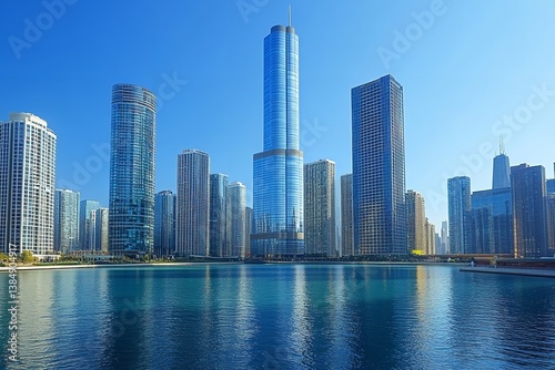 Fototapeta premium Under a bright blue sky, the modern metropolitan skyline is dotted with glass...