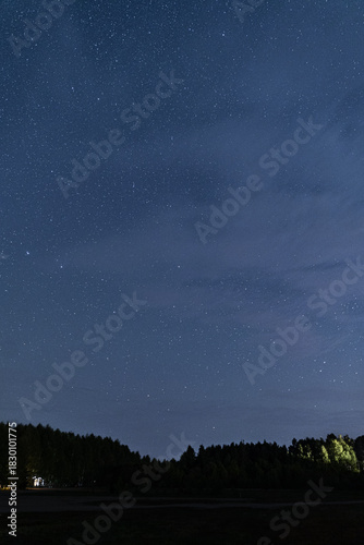 © Tkachenko Alexey, Fototapeta premium Under a vast night sky, stars twinkle above a serene forest. In the distance, a small house glows softly, reflecting tranquility and nature's beauty at night