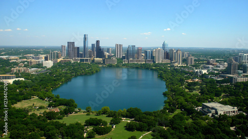 © qibao, Naklejka premium Under the evening blue sky, the iconic skyline of Austin with its tall, modern buildings is clearly reflected in Lake Josephine, presenting a bustling and lively cityscape that defines Texas's capital