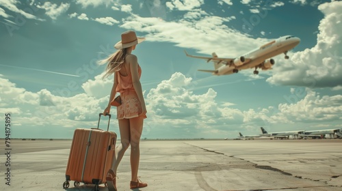 © YURIMA, Obraz premium Under the hot sun, a woman steps towards the entrance of the airport, picking up her suitcase, while plane travels in sky. The overall plan is full growth. Concept: vacations, travel, travel, vacation