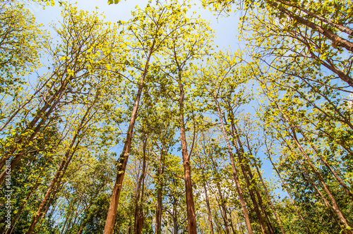 © petcharapj, Fototapeta premium Under view spring teak tree with blue sky.