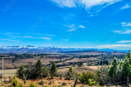 Fototapeta premium Underberg landscape with Snow capped Drakensberg Maloti mountains