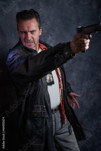 © Alex Shevchenko, Naklejka premium Undercover cop on a dark background, a policeman at work, tough detective, fake badge