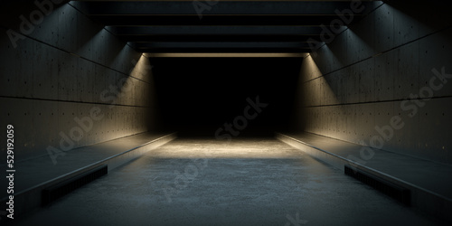 © Maipai, Fototapeta premium Underground Empty Stage Corridor Passage With Sun Light Shade On Concrete Cement Floor 3d Rendering