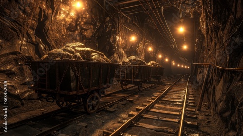 Naklejka premium Underground Mine with Rail Carts Carrying Ore, Generative AI