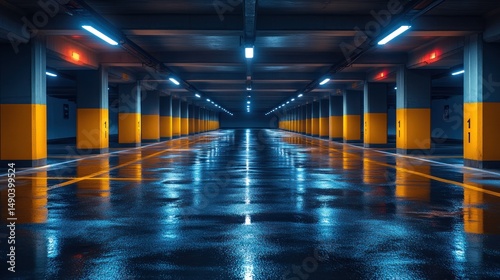 © Alfanachmad, Fototapeta premium Underground Parking Garage: Neon Lights and Wet Floor