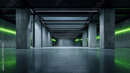 Naklejka premium Underground Parking Garage with Concrete Pillars and Green Neon Lights...