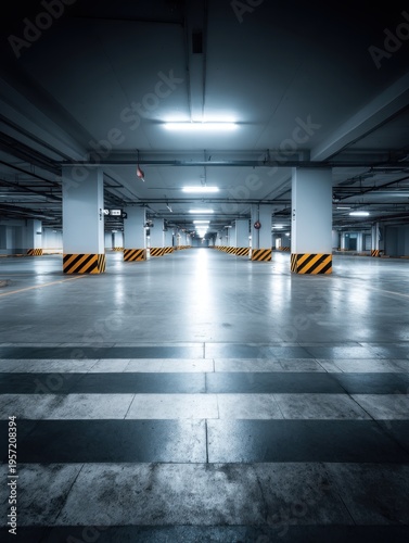Fototapeta premium Underground Parking Garage with Empty Spaces and Striped Barriers,...