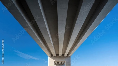 © Anastasiia, Naklejka premium Underneath a concrete highway bridge, parallel beams stretch toward a square pillar, set against a bright blue sky. Concept Industrial Architecture, Underpass Geometry, Parallel Beams, Square Pillar