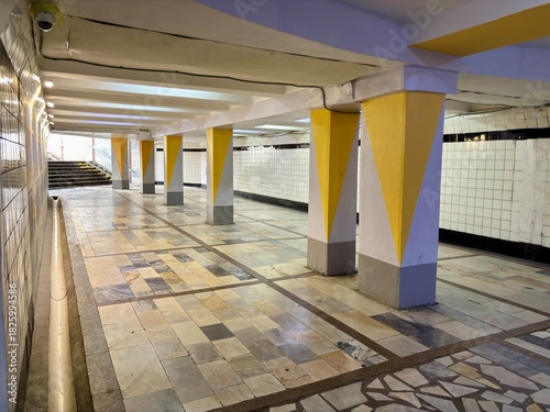 © Cavan, Fototapeta premium Underpass with geometric yellow columns, patterned tile floor