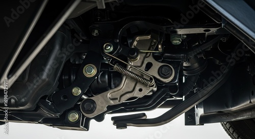 © Proyek, Fototapeta premium Underside of a car showing black and silver mechanical parts with bolts and a spring