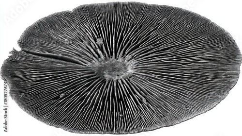 © Mundhut, Fototapeta premium Underside of a mushroom cap with radiating gills against a stark white background