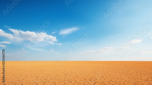 © Passakorn, Naklejka premium Understanding Environmental Impact: Climate Change and Pollution Awareness, Vast sandy landscape under a clear blue sky with scattered clouds.