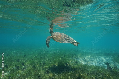 Fototapeta premium Underwater a green sea turtle, Chelonia mydas, breathes to the sea surface, south Pacific ocean, lagoon of Grande Terre island, New Caledonia