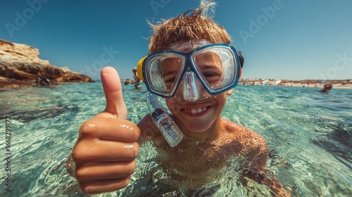 © Ірина Пальцева, Fototapeta premium Underwater Adventures: Boy enjoying water with mask and snorkel, giving thumbs up. Summer joy in refreshing clear waters.
