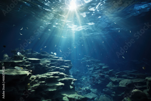 Fototapeta premium Underwater background deep blue sea and light. Ai generative