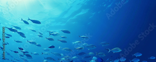 © wolfhound911, Fototapeta premium Underwater background with a school of fish swimming against a gradient blue sea.