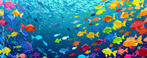 Naklejka premium Underwater background with schools of tropical fish in every color of the...