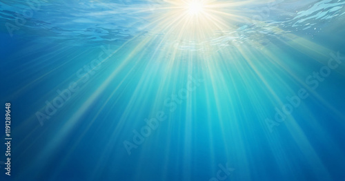 Fototapeta premium Underwater background with sun rays. Vector realistic underwater view. Ocean deep water, sea under water level, sun rays blue wave horizon.