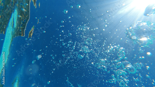 Obraz premium Underwater bubbles emerging to turquoise sea surface