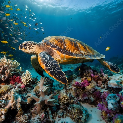 © Chamika, Fototapeta premium Underwater Calm: A Loggerhead Turtle's Peaceful Haven