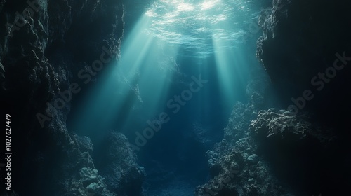 Obraz premium Underwater Cave with Sunbeams Illuminating the Dark Depths