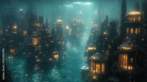 © julija, Obraz premium underwater cityscape made entirely of flowing water currents bioluminescent sea life weaving through translucent architecture