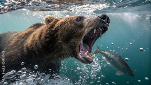 © buggal1406, Obraz premium Underwater close-up of a bear lunging for fish with open mouth and bubbles