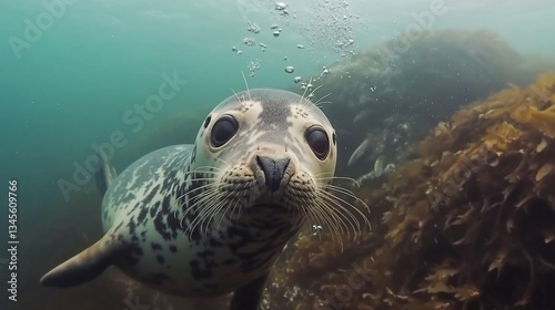 Fototapeta premium Underwater close-up of a curious seal pup swimming near kelp forest.