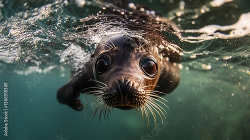 © BerkahStock, Fototapeta premium Underwater close-up of a curious seal pup swimming near the surface.