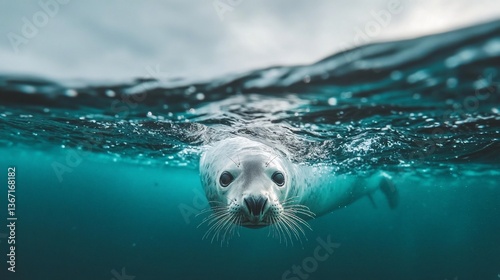 © BerkahStock, Fototapeta premium Underwater close-up of a curious seal swimming in the ocean.
