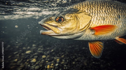 © Akael, Fototapeta premium Underwater Close-Up of a Fish with Vibrant Colors Swimming in Clear Water