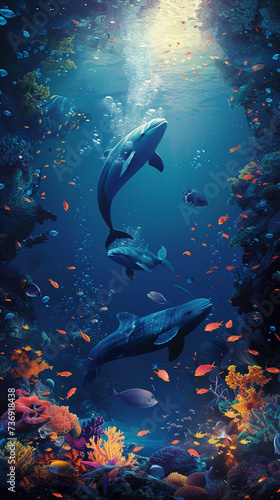 Fototapeta premium underwater concert with sea creatures as the audience lit by deep sea lights