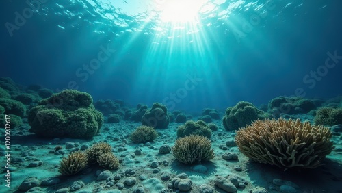 Fototapeta premium Underwater coral reef affected by bleaching with sunlight streaming through