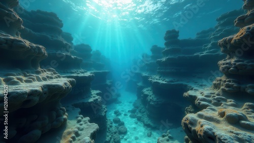 © Xavi, Fototapeta premium Underwater coral reef caves affected by bleaching with sunlight streaming in