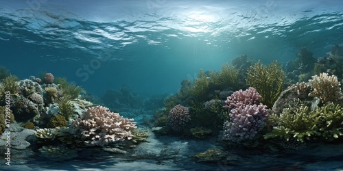 © Ayou.Y, Fototapeta premium Underwater coral reef ecosystem hdri panoramic view equirectangular environment