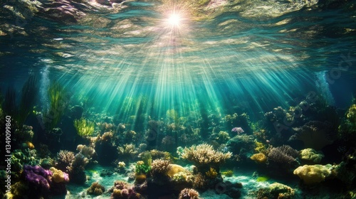 Obraz premium Underwater Coral Reef Illuminated by Sunlight