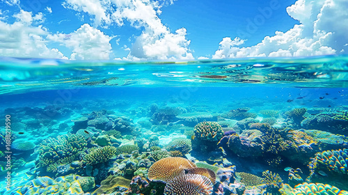 Naklejka premium Underwater coral reef landscape, crystal-clear blue water.