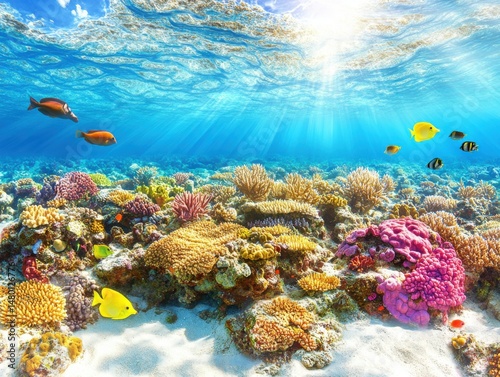 Naklejka premium Underwater coral reef landscape with tropical fish swimming in crystal clear ocean water sun rays shining down scenic view