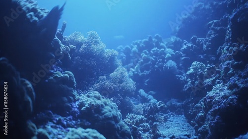 © bulegendut, Naklejka premium Underwater coral reef scene, deep blue ocean.