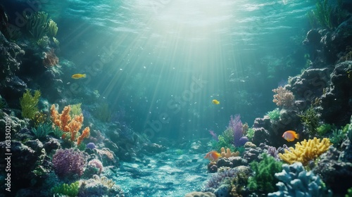 Fototapeta premium Underwater coral reef scene. Sunlight streams through the water, illuminating vibrant coral formations and colorful fish