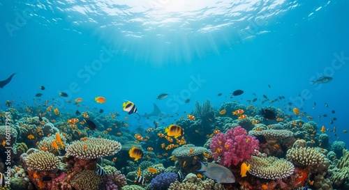 Fototapeta premium Underwater Coral Reef Scene with Colorful Fish and Sunlight