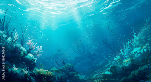 Fototapeta premium Underwater Coral Reef Scene With Sunlight